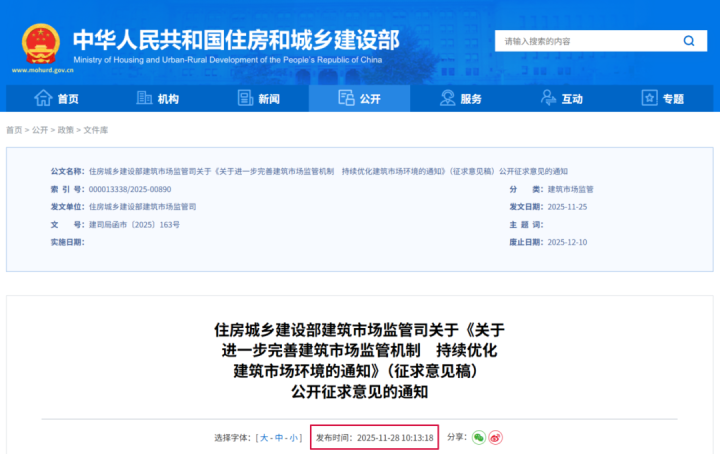 住建部官网赫然发布了一则《关于进一步完善建筑市场监管机制持续优化建筑市场环境的通知》(征求意见稿)。